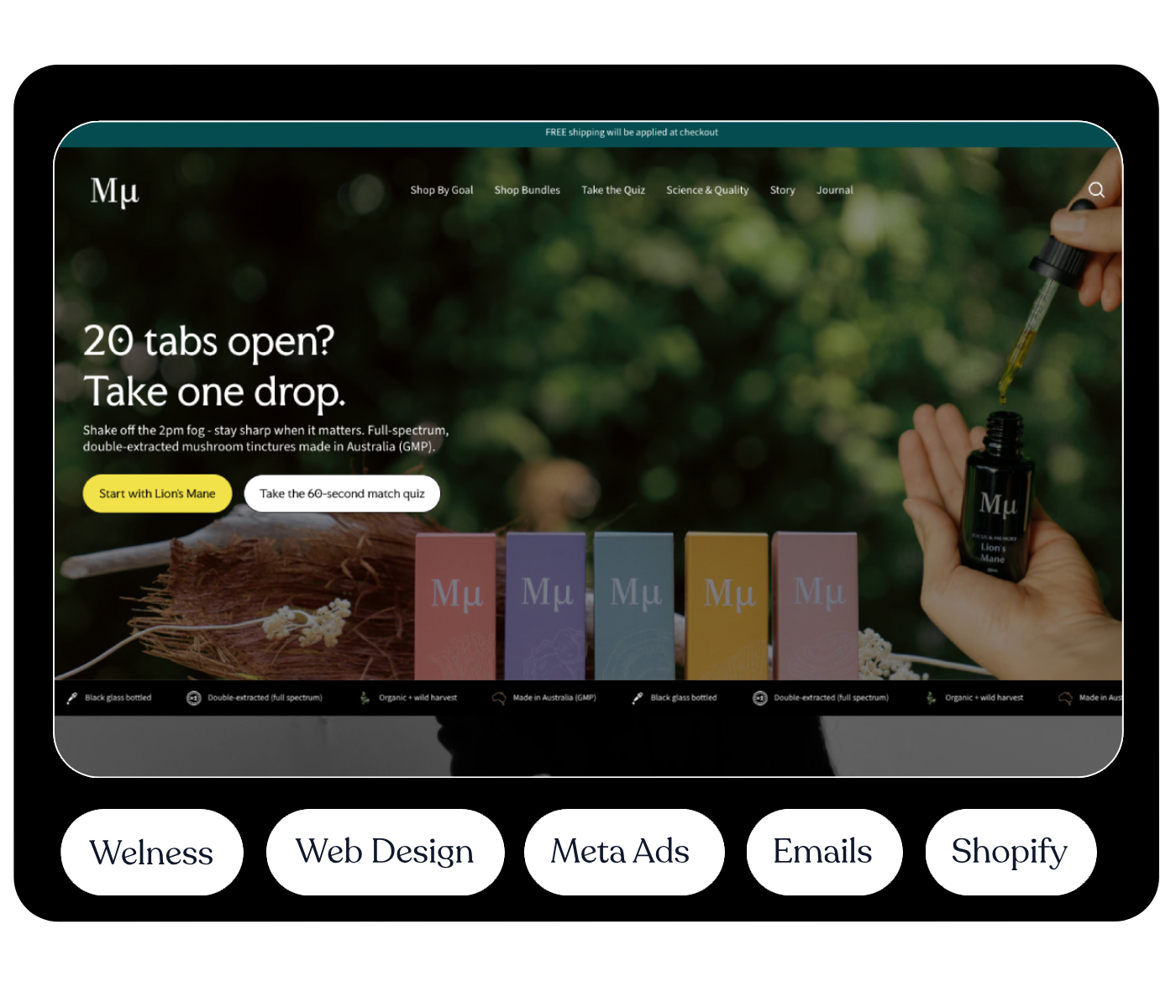 We work best with wellness and supplement brands on Shopify – typically founder-led, usually growing but not as fast as they should be. You might have a product people love but systems that aren’t keeping up. Or you might be early, with a clear vision and no infrastructure yet. Either way, you take your brand seriously and you want a team that does the same..